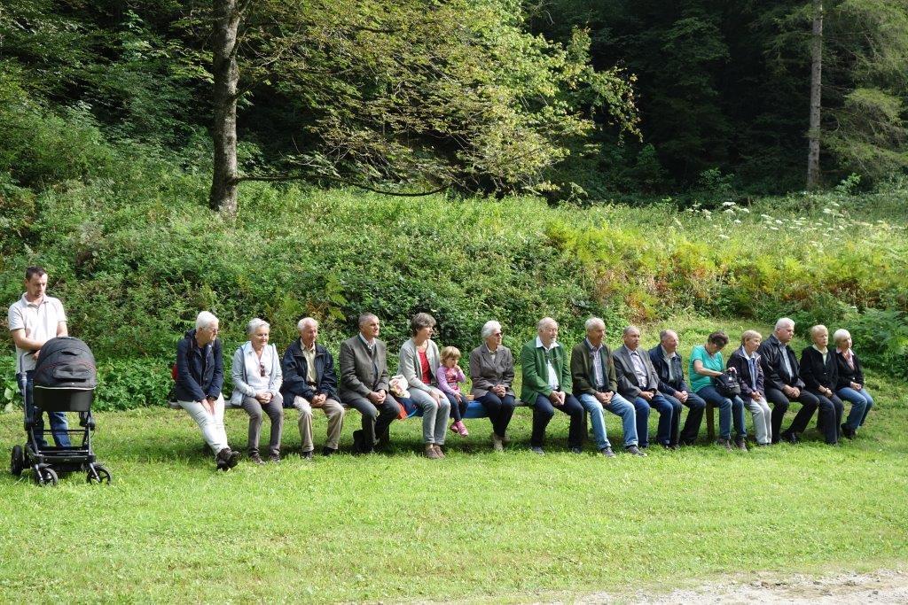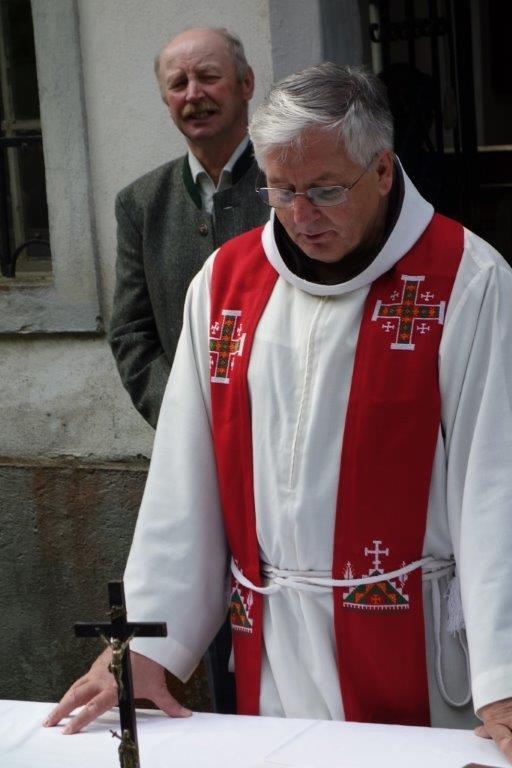 In Vertretung des Fußwallfahrers P. Simon zelebrierte Franziskaner-Guardian P. Josef Höller aus Graz in launiger Weise die Eucharistie, zu der rund 80 Gläubige bei herrlichem Wetter zu Fuß, mit den Fahrrädern oder per Auto gekommen sind.