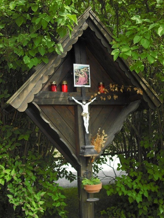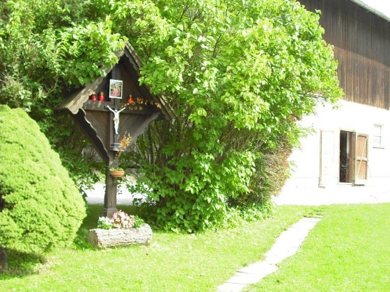 Dieses wunderbare Holzkreuz mit der Christusfigur steht zwischen dem Wohnhaus von Johann Fuchsbichler vlg. Hansbauer und Stall im Hofbereich, umgeben von schönen Flieder-, Jasmin- und Wacholdersträuchen.