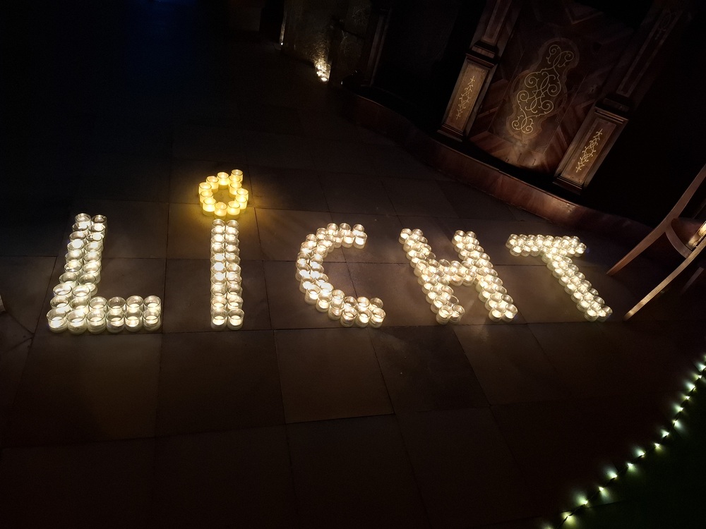 Viele, aus Kerzenlichtern gestellte Figuren konnten bestaunt werden: ein Engel, ein Kelch, ein buntes Kirchenfenster, Sterne in allen Varianten, ein schön beleuchteter Altarraum mit einem Engel und der Engel des Herrn in verschiedenen Sprachen, ein Sternenhimmel und vieles mehr. Als Besucher konnte man sich auch aktiv beschäftigen – einen Leuchtstein in den Himmel legen und ein Sterngedicht mit nach Hause nehmen.