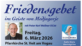 Friedesgebet im Geiste von Medjugorje Programm: 16.00 Uhr: Vortrag zum Thema "Jeder kann Missionar sein" mit Pater Dr. Karl Wallner im Kultursaal St. Veit am Vogau 17.45 Uhr: Rosenkranz in der...